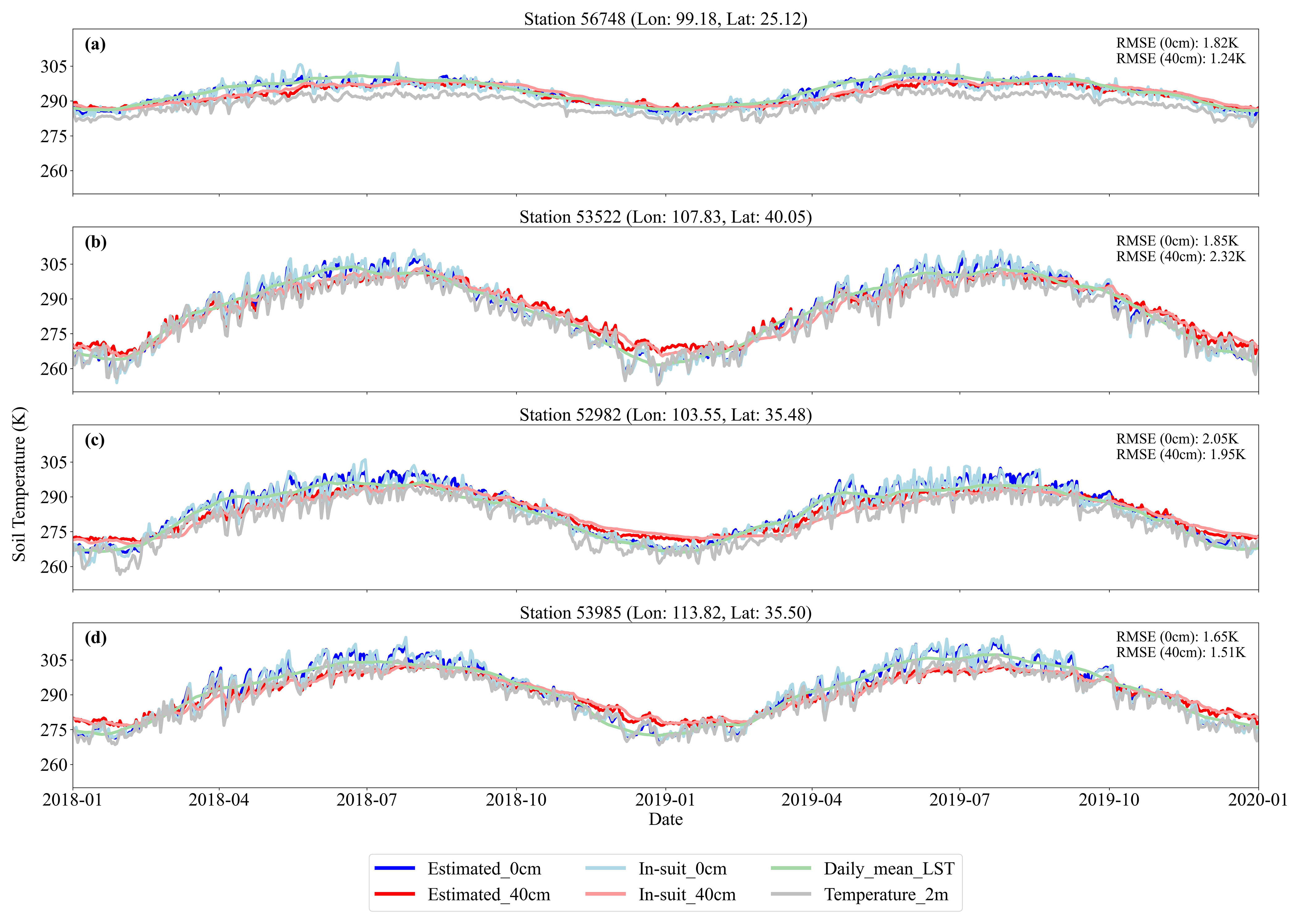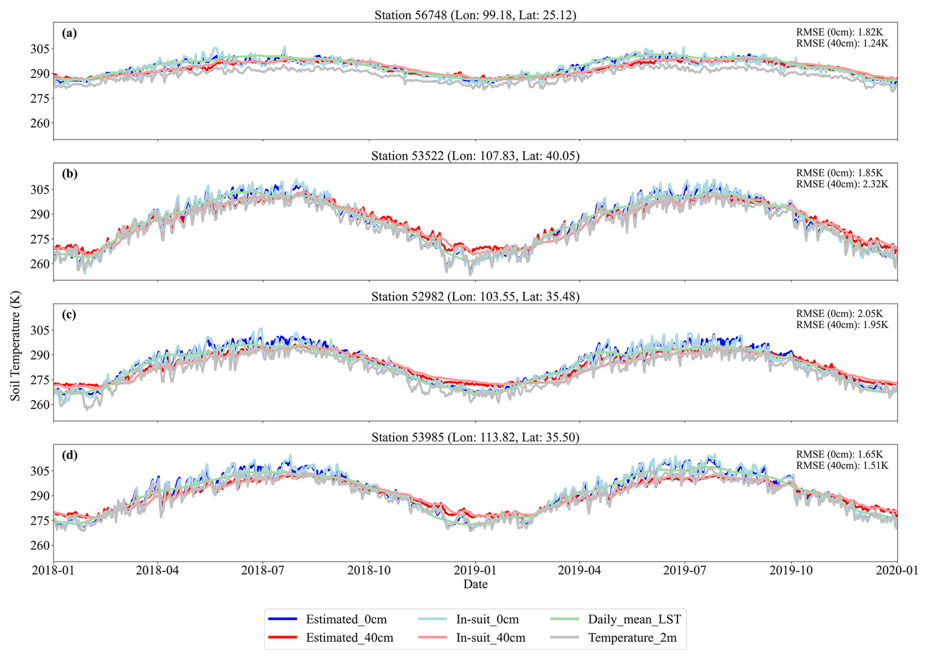 To further assess the temporal performance of Ts estimation, Fig. 11 presents the time series of estimated Ts alongside in-situ measurements at four randomly selected stations (e.g., Station 56748, 99.18° E, 25.12° N) from January 2018 to January 2020. The figure displays Ts at two depths (0 and 40 cm), including estimated Ts (Estimated_0 cm, Estimated_40 cm), in-situ Ts (In-situ_0 cm, In-situ_40 cm), daily mean land surface temperature (Daily_mean_LST), and 2 m air temperature (Temperature_2 m). The air temperature shows distinct seasonal cycles, while Ts exhibits smoother temporal variations. In general, Ts reaches its peak during summer and its minimum in winter, though its temporal dynamics vary with soil depth. Specifically, Ts at 0 cm responds rapidly to air temperature changes and exhibits larger amplitude variations, while Ts at 40 cm shows slower responses and a noticeable lag, reflecting the damping effect of vertical heat conduction. Site-level accuracy was evaluated using RMSE, which ranged from 1.24 to 2.05 K across both depths, indicating strong agreement between predicted and observed values. Overall, the time series analysis confirms the robustness and reliability of the model in estimating Ts across varying depths, offering valuable insights into regional soil thermal dynamics.