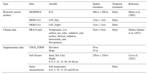 Topographic and soil-related variables were incorporated as auxiliary predictors to improve the accuracy of Ts estimation. Elevation and slope were derived from the Shuttle Radar Topography Mission (SRTM) digital elevation model (Farr et al., 2007), specifically using the Version 3 (SRTM Plus) product with a spatial resolution of 1 arcsec (∼ 30 m). Soil texture plays a critical role in determining Ts through its influence on thermal conductivity, which is affected by physical properties such as particle size distribution, porosity, bulk density, and moisture retention capacity. In this study, we represented soil texture using the relative proportions of clay (fine), silt (medium), and sand (coarse) particles. To capture vertical variability in soil properties, we employed the China Soil Information Grid dataset developed by Liu et al. (2022), which provides gridded estimates of soil composition at four depth intervals: 0–5, 5–15, 15–30, and 30–60 cm. The dataset offers a spatial resolution of 1 km and is suitable for high-resolution, profile-based soil modeling.