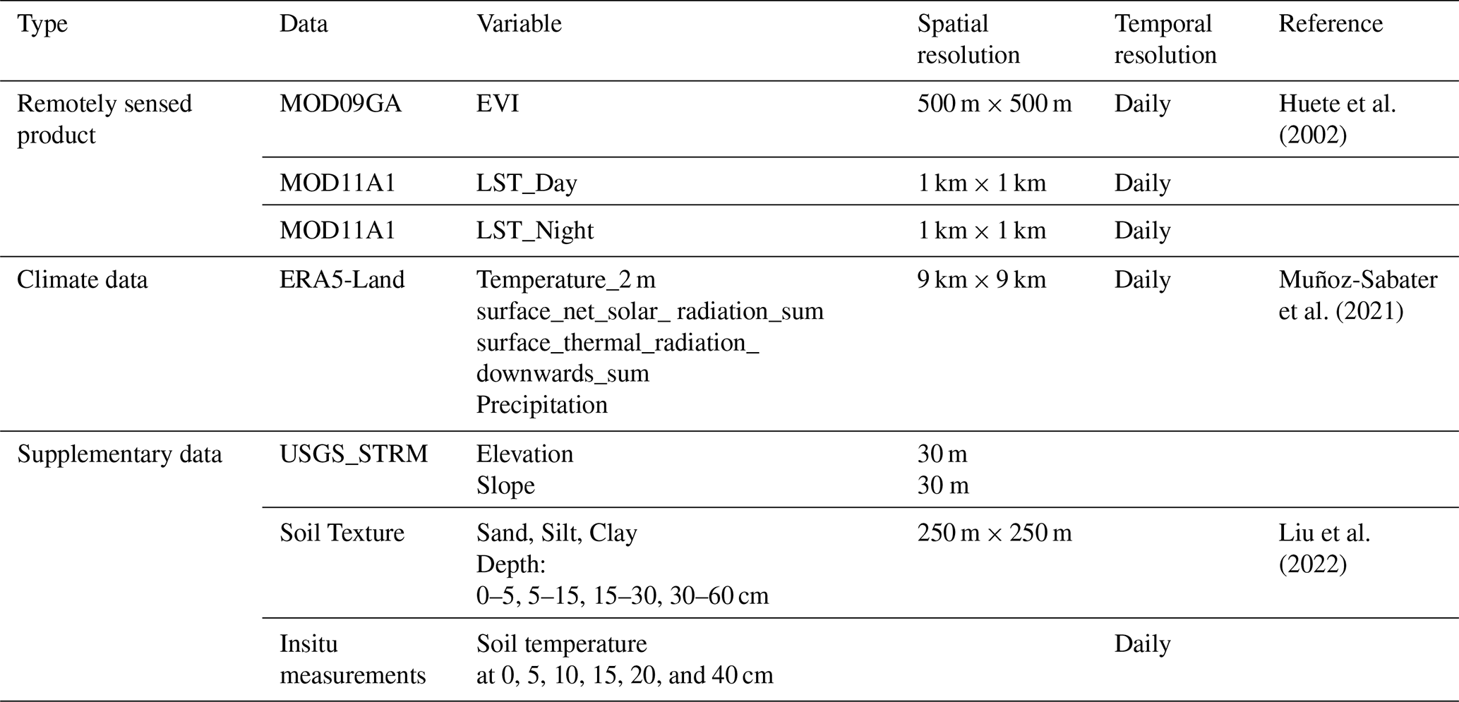 Thermal infrared remote sensing data also exhibit a high correlation with near-surface Ts. Integrating thermal remote sensing products and energy balance-based models offers an effective means of estimating Ts with high spatial and temporal continuity. This strategy has been validated by numerous studies (Huang et al., 2020; Xu et al., 2023). Surface land cover further modulates Ts by altering surface albedo, regulating evapotranspiration (ET), and influencing energy partitioning processes. Accordingly, the enhanced vegetation index (EVI), derived from satellite observations, was incorporated as a proxy for vegetation density and type (Bright et al., 2017; Li et al., 2024b). To capture the influence of underlying surface characteristics on Ts, topographic variables such as elevation and slope were included, along with soil texture data across various depths. These features collectively reflect the heterogeneous physical and thermal properties of the soil, contributing to spatial variations in heat conduction and storage capacity. A full list of the predictor variables used in the model is summarized in Table 1.